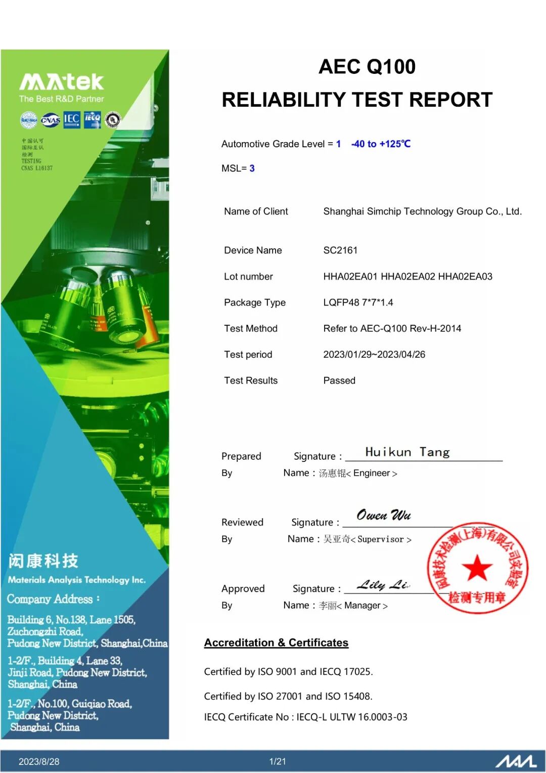 AEC-Q100 Grade 1 证书